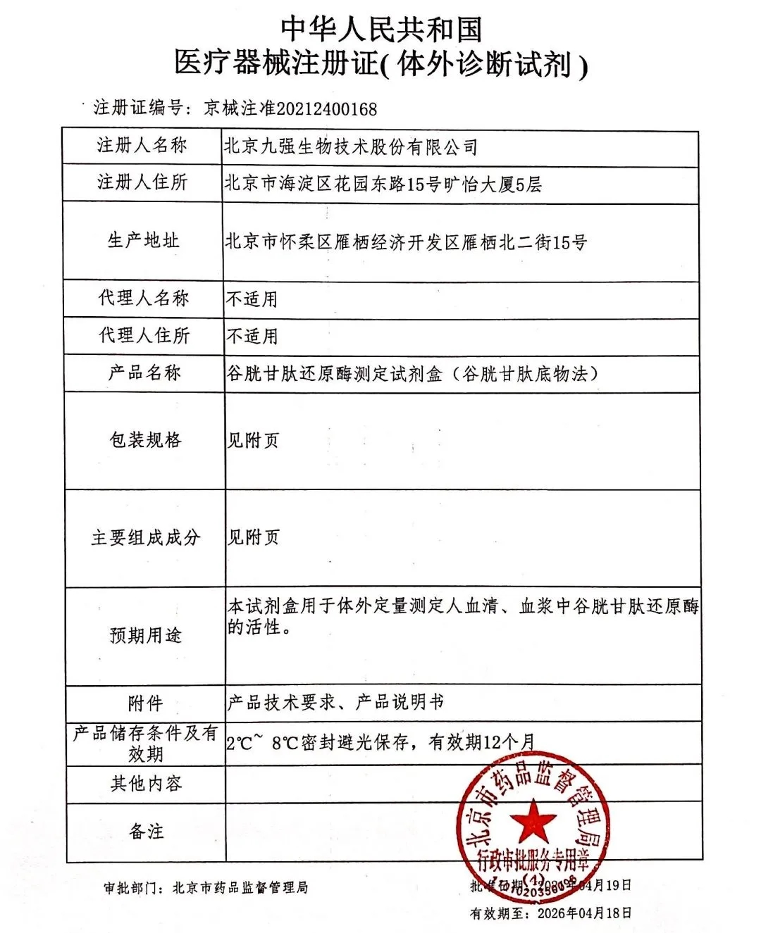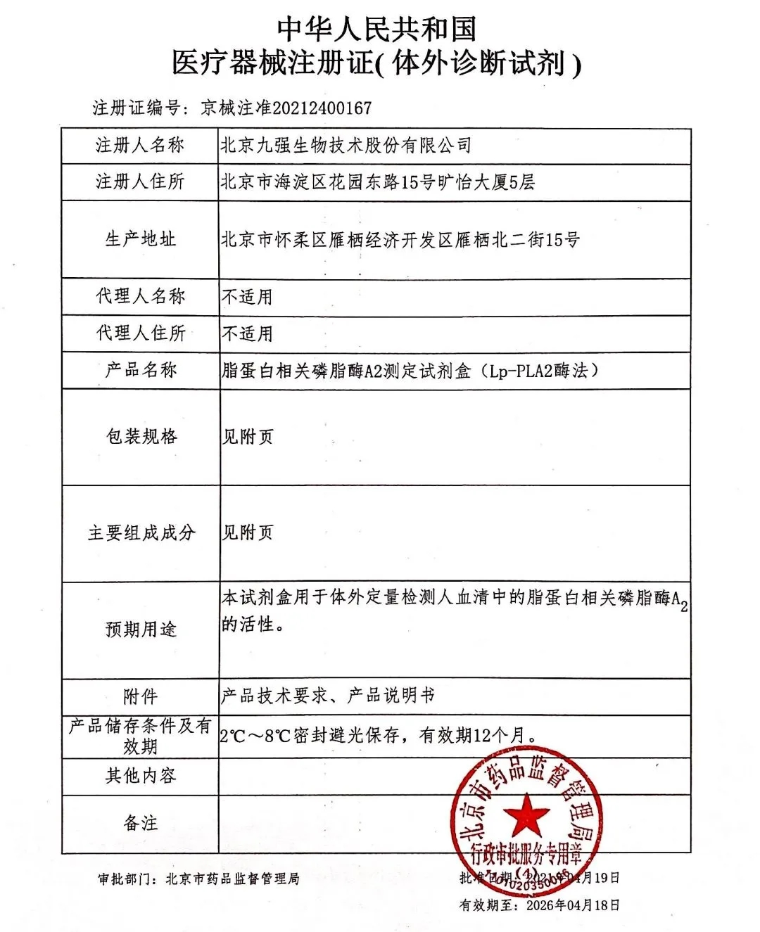 九強(qiáng)生物順利取得北京市藥品監(jiān)督管理局頒發(fā)的三項(xiàng)產(chǎn)品的《醫(yī)療器械注冊證》:谷胱甘肽還原酶(液體)測定試劑盒(谷胱甘肽底物法)、脂蛋白相關(guān)磷脂酶A2測定試劑盒(Lp-PLA2酶法)和胰淀粉酶測定試劑盒(EPS-G7法)。