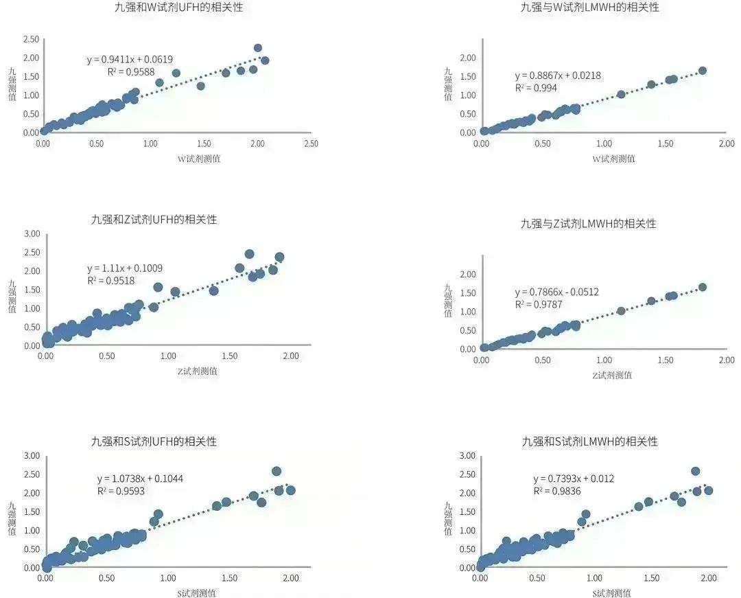 九強(qiáng)抗Xa測定試劑盒(發(fā)色底物法)通過顏色變化來測定抗凝強(qiáng)度/血藥濃度,線性寬,抗干擾能力強(qiáng),精密度高,與市場主流廠家試劑相關(guān)性良好,R2>0.95,可滿足臨床檢測需求。