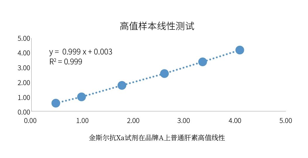 (2)國產(chǎn)抗Xa試劑可以滿足臨床預(yù)期用途:九強(qiáng)抗Xa試劑盒普通肝素線性可以做到4IU/mL,不僅可以滿足說明書所宣稱的1.2IU/mL,同時(shí)可以滿足臨床上的一些異常特殊高值樣本的檢測需求;