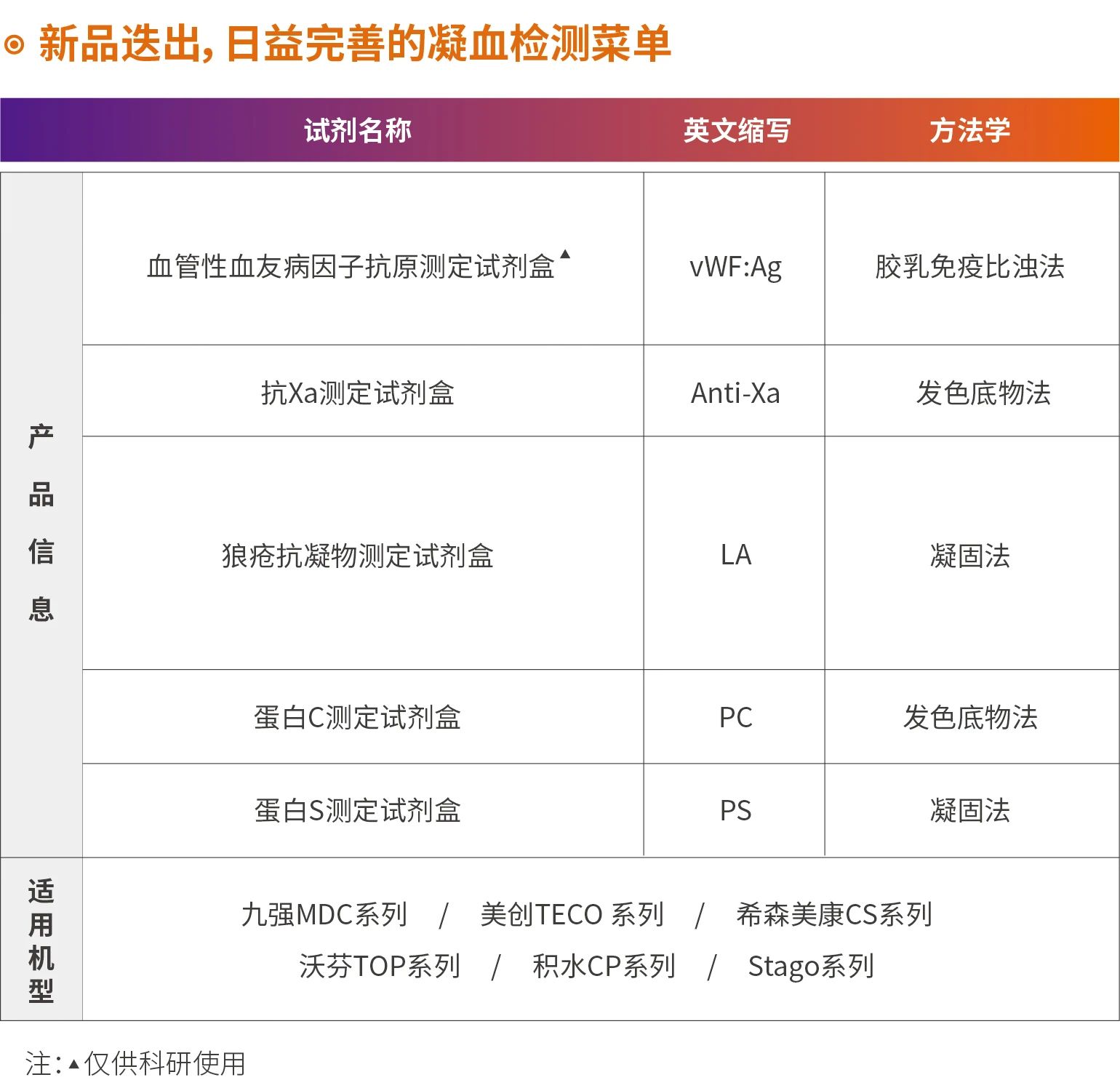 九強生物是中國領(lǐng)先的臨床體外診斷產(chǎn)品與服務(wù)供應(yīng)商之一,目前擁有自主研發(fā)的全自動凝血檢測分析儀MDC7500和MDC3500以及德國原裝進(jìn)口的Coatron5000、Coatron3000和Coatron1800,專業(yè)配套的凝血檢測試劑在滿足自有檢測系統(tǒng)的同時也能完美匹配主流血凝檢測系統(tǒng),滿足不同客戶的需求,為臨床提供全面的血栓與止血實驗室解決方案。