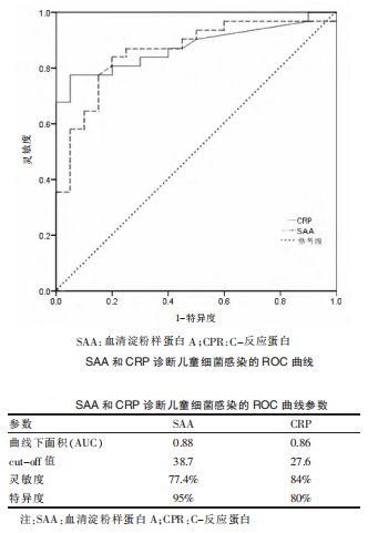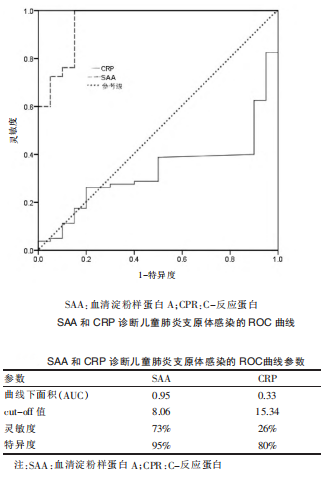 李攀等[3]探討血清淀粉樣蛋白A(SAA)和C-反應(yīng)蛋白(CPR)檢測(cè)對(duì)兒童支原體肺炎的診斷價(jià)值。包括支原體感染患兒124例(支原體感染組)、細(xì)菌感染患兒35例(細(xì)菌感染組),同期健康體檢兒童20例(對(duì)照組),分別測(cè)定和分析三組SAA和CRP水平,并應(yīng)用ROC曲線進(jìn)行分析。結(jié)果表明:SAA檢測(cè)對(duì)診斷兒童肺炎支原體感染和細(xì)菌感染的準(zhǔn)確性均較高;CRP檢測(cè)對(duì)診斷兒童細(xì)菌感染準(zhǔn)確性較高,但對(duì)于鑒別診斷兒童肺炎支原體的意義較小。SAA 檢測(cè)可用于兒童肺炎支原體感染的鑒別診斷,應(yīng)在臨床中廣泛應(yīng)用。