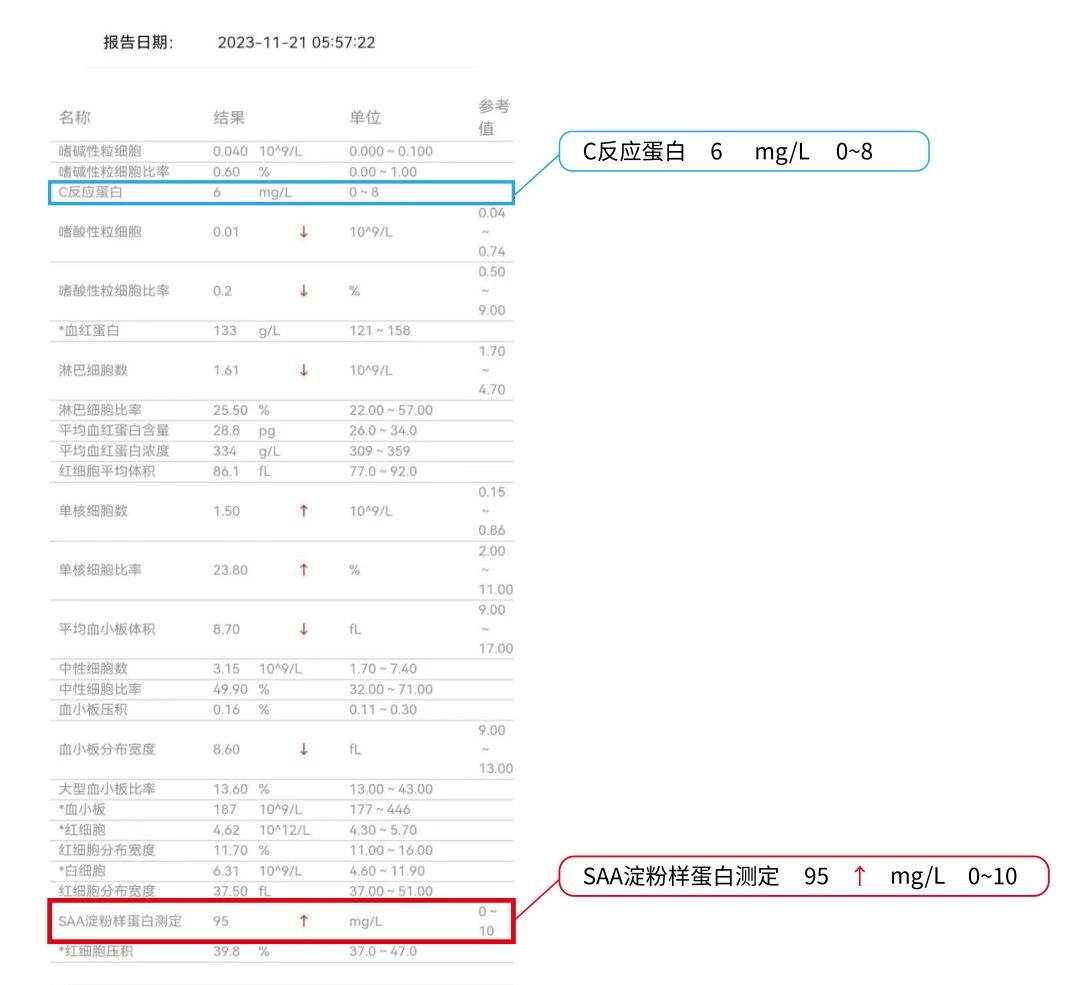 在常見的血液檢測(cè)指標(biāo)中,除常規(guī)的血常規(guī)、C反應(yīng)蛋白(CRP)檢測(cè)外,另一炎癥指標(biāo)——血清淀粉樣蛋白A(SAA)的檢測(cè)在該類疾病的診療中敏感性備受關(guān)注。
