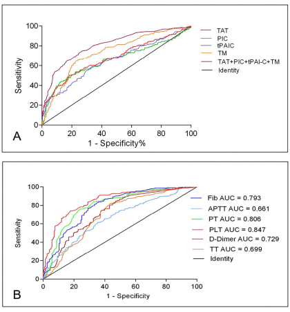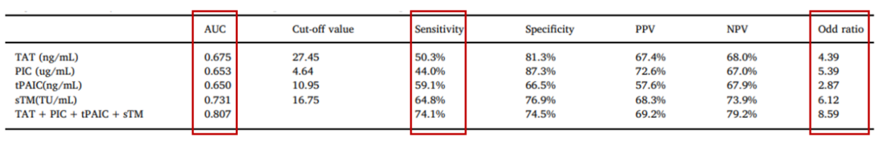 一項多中心前瞻性觀察研究表明TAT、PIC、tPAIC和sTM在不同基礎(chǔ)疾病的DIC患者中表現(xiàn)出良好的診斷性能和預(yù)后價值,TAT、tPAIC和sTM在pre-DIC的診斷具有一定的意義。此外,新血栓四項聯(lián)合檢測可增加AUC、靈敏度和優(yōu)勢比,具有更高的檢測效能,有助于及時干預(yù)。